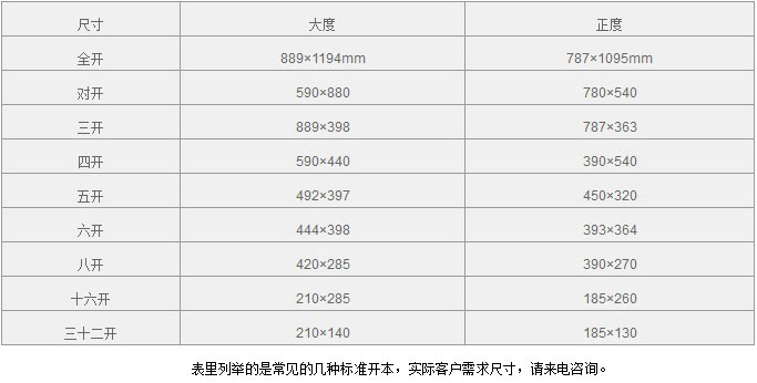2、國際標準 A4=210×297㎜ 1P=16開=A4.紙張的克重(紙張的克重是指每平方米紙張的重量,如70g是指每平方米紙的克重是70克;克重越高, 紙張越厚)。 常用的印刷紙張克重通常有以下幾種: 1、雙膠紙:60g 、70g、80g、100g、120g、140g不等 2、古版紙:52g 3、打字紙:28g、42g 4、銅版紙:60g輕涂、80g、100g、128g、157g、200g、250g、300g 、350g等 5、包裝用紙:一般分灰底白、白底白、銅版白卡等幾種,規格、品牌不同克重不一。 6、特種紙:一般用于包裝、書幀裝潢、文件資料的封皮及墊襯用,規格不同,克重不同,價格也不一樣,具體請按實際樣本。